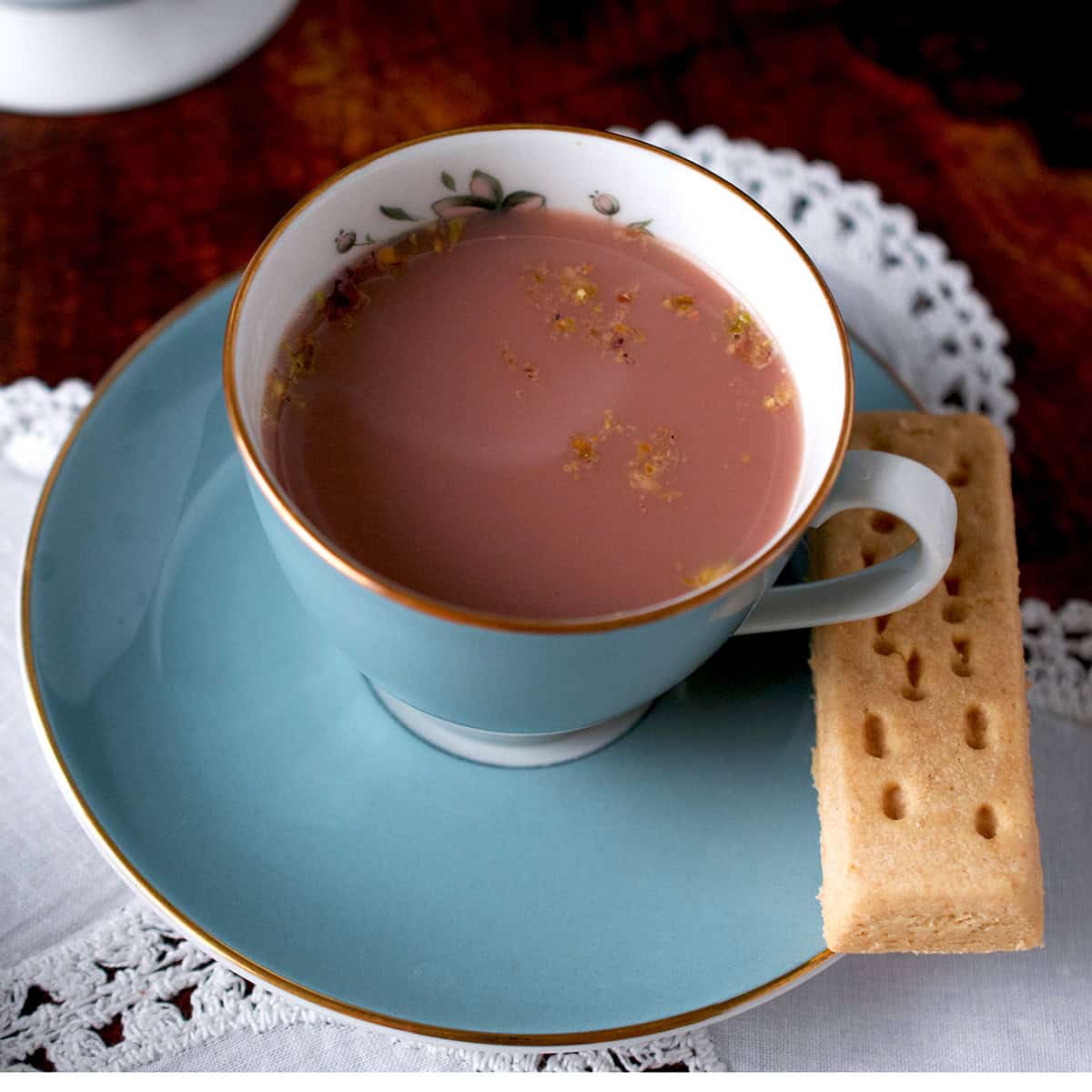 In my family, this tea is prepared the traditional way, with salt added. Of course, as a child, I would usually sneak in some sugar, and the result is that I drink my pink tea with both salt and sugar! Once you try it that way, there’s no going back!